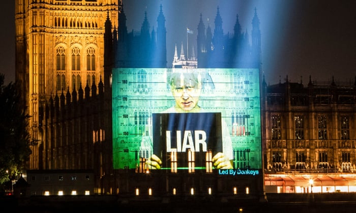 Nella capitale britannica, una massiccia proiezione illumina le Camere del Parlamento raffigurando il Primo Ministro britannico Boris Johnson come un criminale.